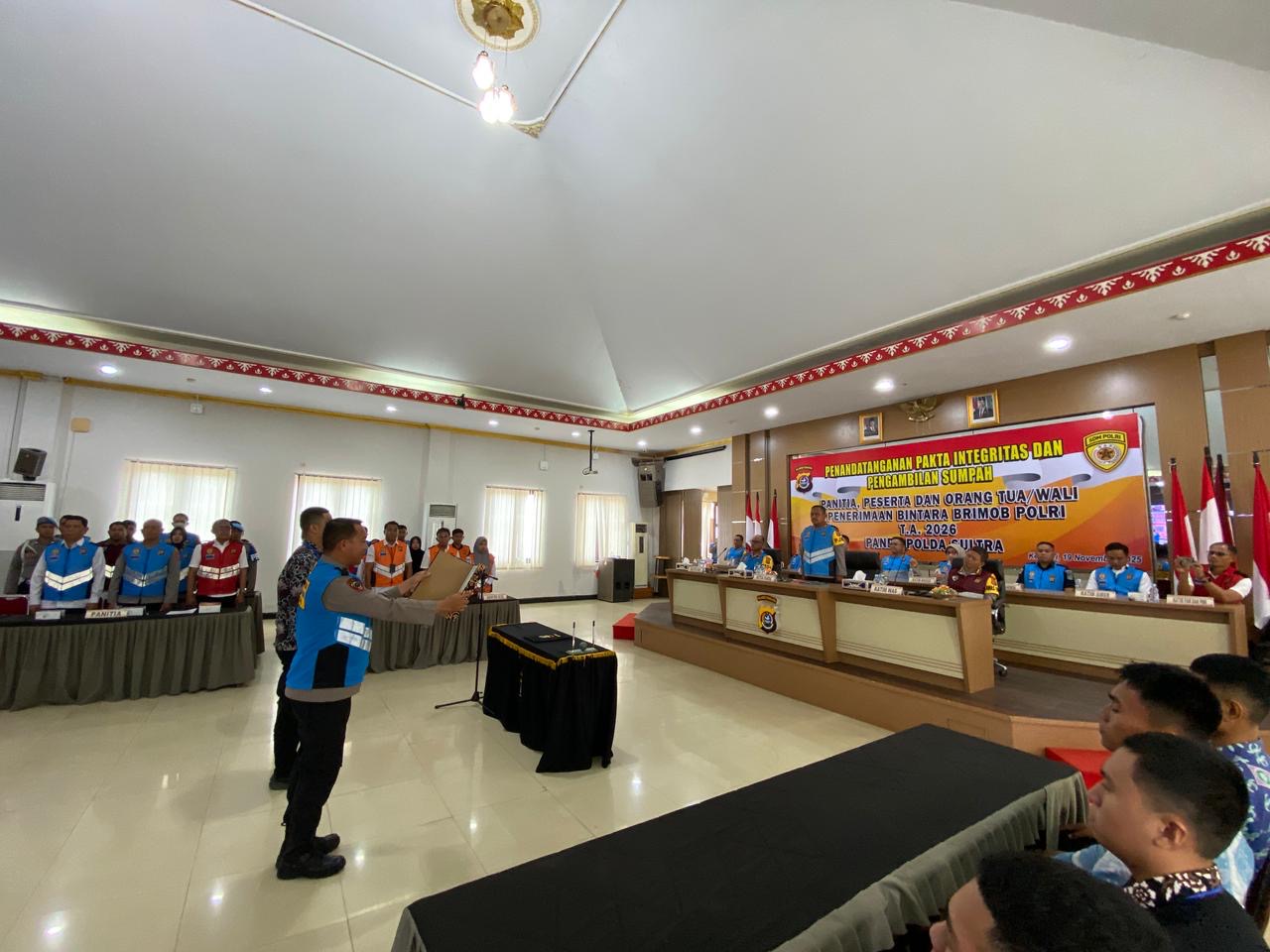 KENDARI — Kepolisian Daerah (Polda) Sulawesi Tenggara (Sultra) menggelar penandatanganan pakta integritas serta pengambilan sumpah panitia, peserta, dan orang tua/wali Penerimaan Bintara Brimob Polri Tahun Anggaran 2026.