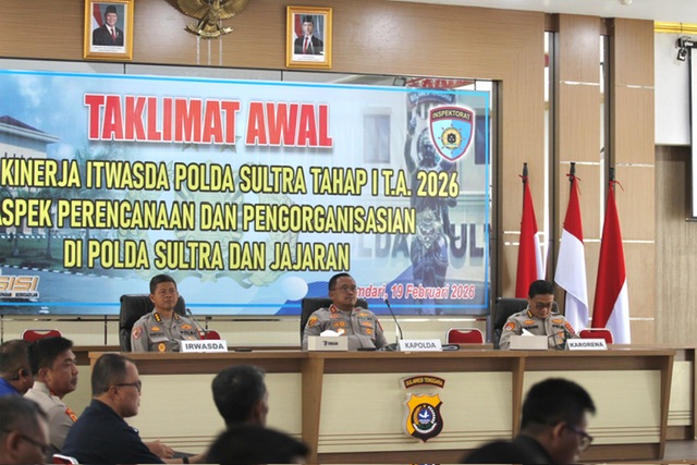 KENDARI – Kapolda Sulawesi Tenggara, Irjen Pol Didik Agung Widjanarko, S.I.K., M.H., memimpin Taklimat Awal Audit Kinerja Inspektorat Pengawasan Daerah (Itwasda) Tahap I Tahun Anggaran 2026 yang digelar di Aula Dhacara Polda Sulawesi Tenggara, Kamis (19/2/2026).